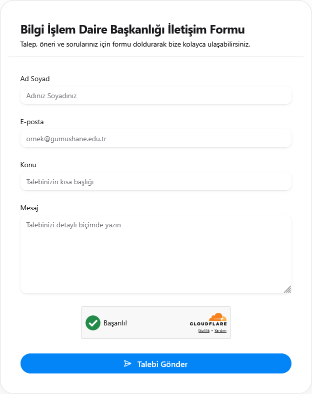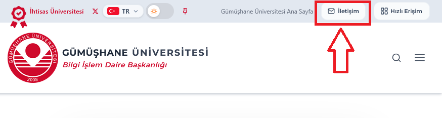 Bilgi İşlem Daire Başkanlığı (bidb.gumushane.edu.tr) web sitesinde sağ üst kısımda bulunan "İletişim" formunu doldurarak destek taleplerinizi iletebilirsiniz.